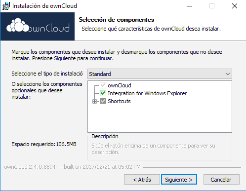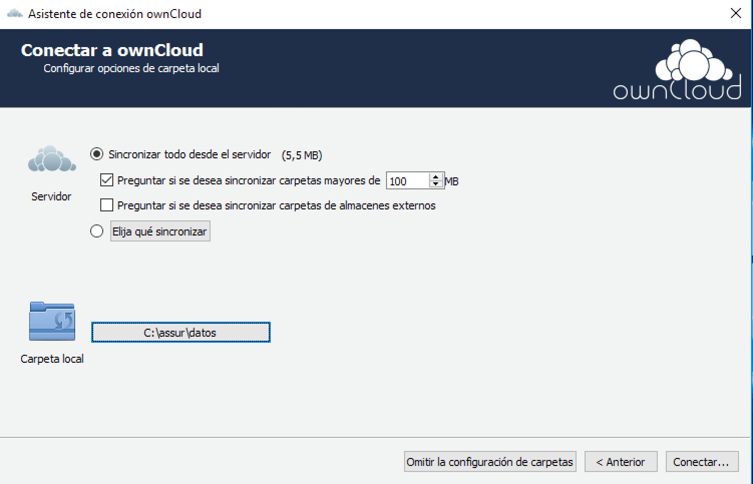 Lo primero que tenemos que hacer es irnos a la unidad c:/ y crear una carpeta que se llame assur/datos. Una vez hecho esto , iremos a Inicio – Programas – owncloud y en la primera pantalla pondremos los siguientes datos: